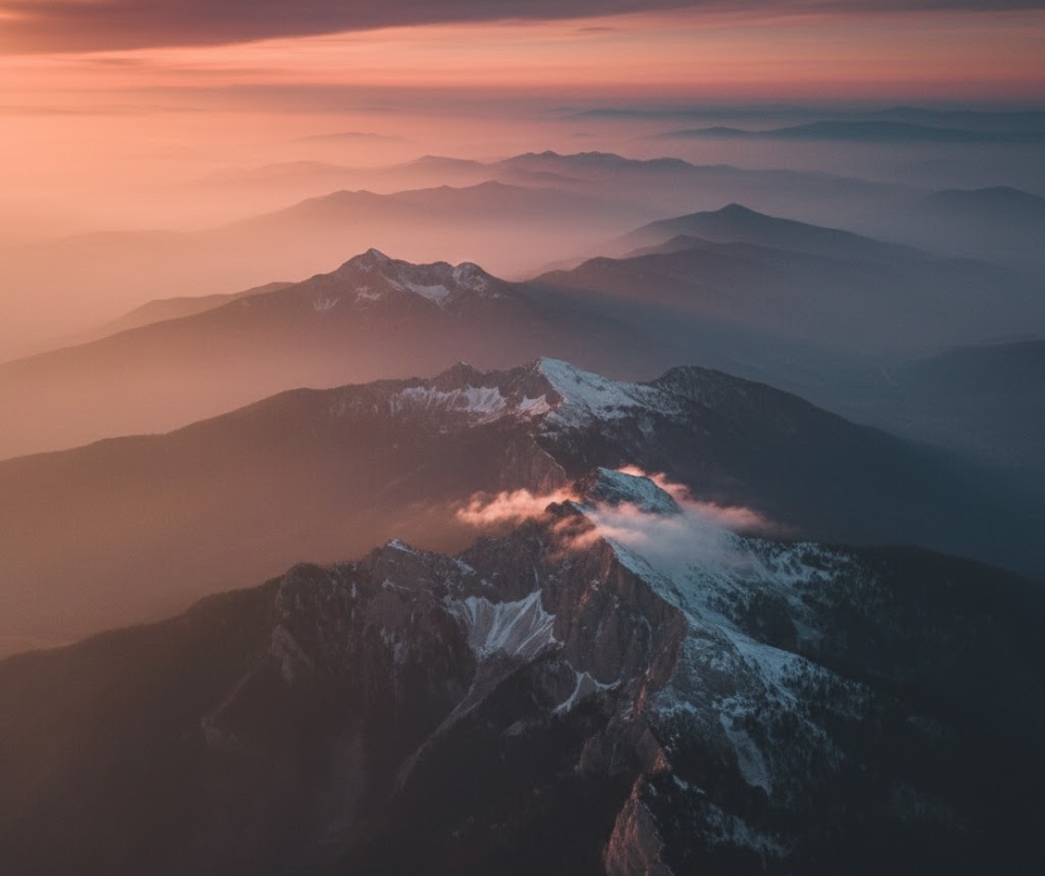 "Misty mountain peaks at golden hour, layers of mountains fading into distance, warm orange and pink sky, dramatic side lighting, cinematic landscape photography, aerial perspective"