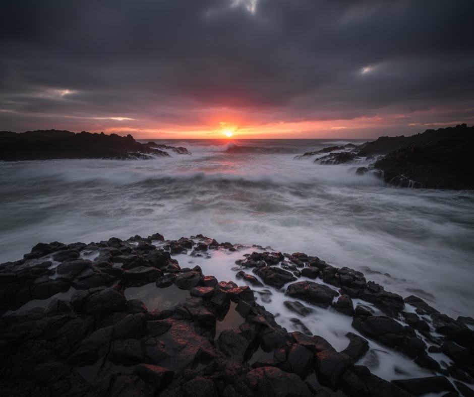 "Long exposure effect" smooths the water like silk. Black rocks against orange sky = contrast. Moody sky adds weight. This is magazine cover territory.