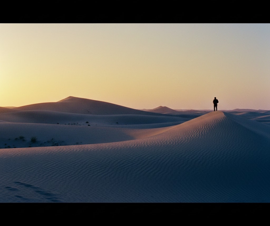 "Vast desert landscape at dawn, sand dunes casting long shadows, warm golden light, single traveler silhouette in distance, cinematic widescreen composition, film grain"