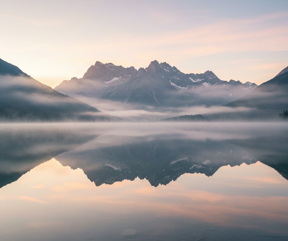 "Pristine alpine lake with perfect mountain reflection, early morning mist, glass-like water surface, cinematic symmetry, pastel sunrise colors"