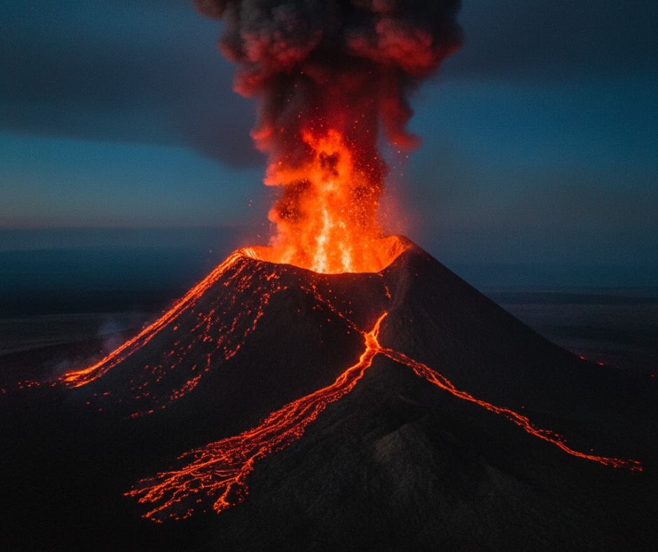 Lava glow is pure visual candy. Blue twilight vs orange lava = perfect contrast. Aerial view shows scale. This is National Geographic territory.