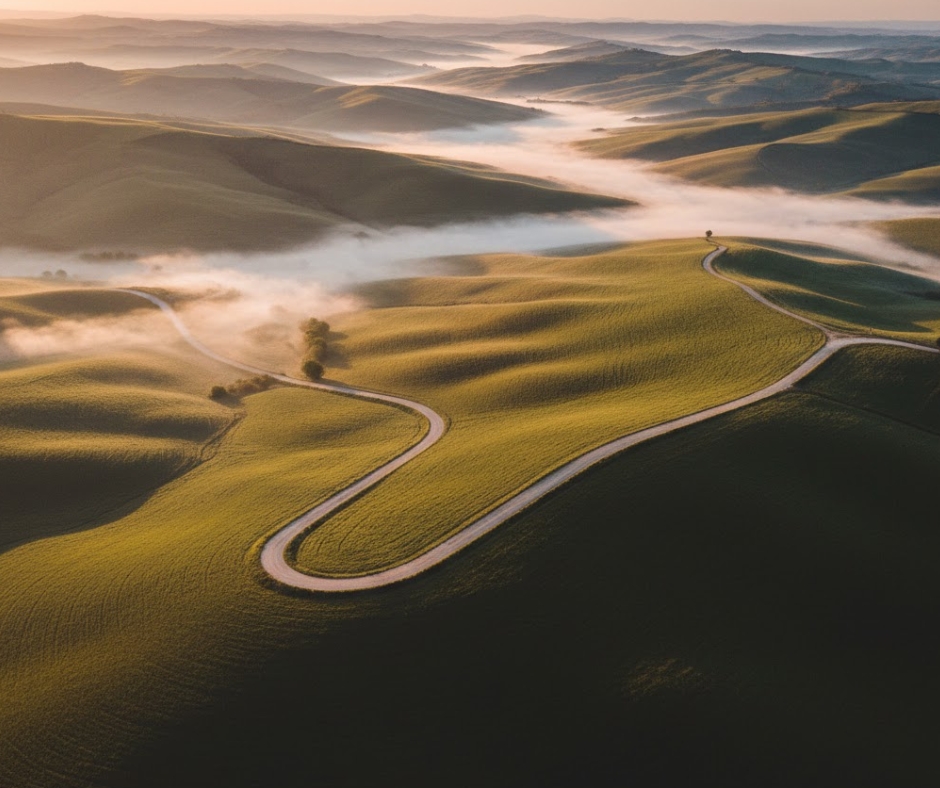 Winding road guides the eye. Fog in valleys adds depth. "Italian countryside" triggers specific aesthetic. Drone perspective shows patterns.