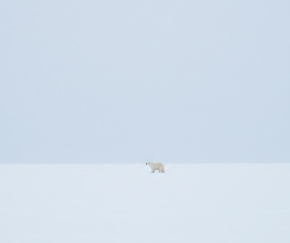 "Minimal arctic landscape, vast white snow plain, single polar bear in distance, overcast sky creating soft light, cinematic widescreen composition, muted color palette"