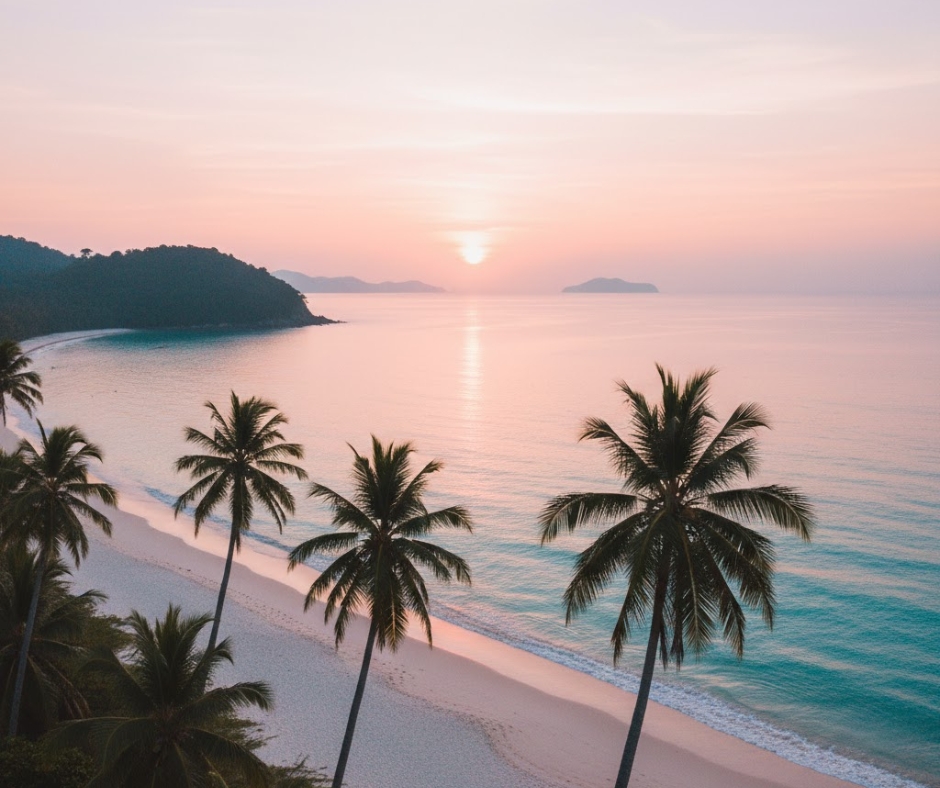 "Tropical beach at sunrise, palm trees silhouetted against pink and orange sky, turquoise water, white sand, cinematic paradise scene, shot from elevated angle"