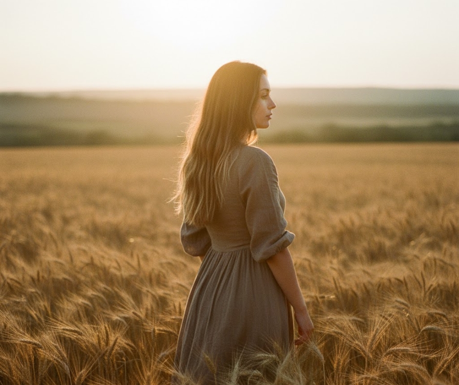 "Natural outdoor portrait of someone in their mid-20s, golden hour sunlight, warm backlit glow, standing in wheat field, candid looking away from camera, photorealistic, shot on film camera"