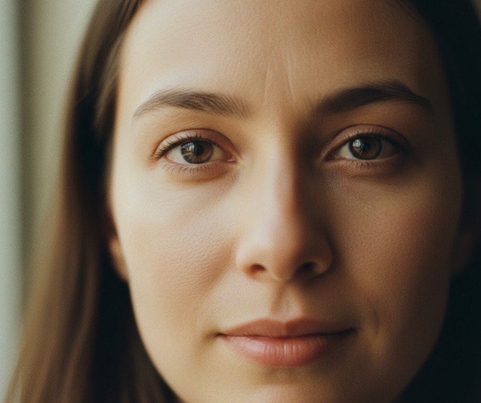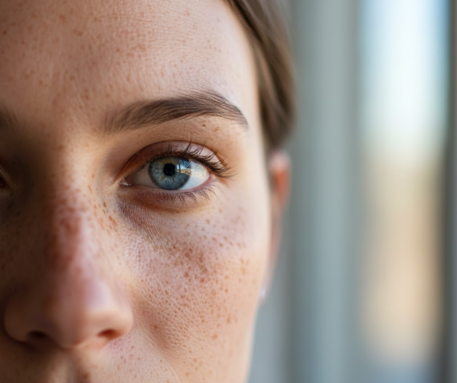 "Extreme close-up portrait of person's face, natural window lighting, freckles and skin texture visible, eyes in sharp focus, ultra-realistic skin details, shot with macro lens, soft bokeh background"