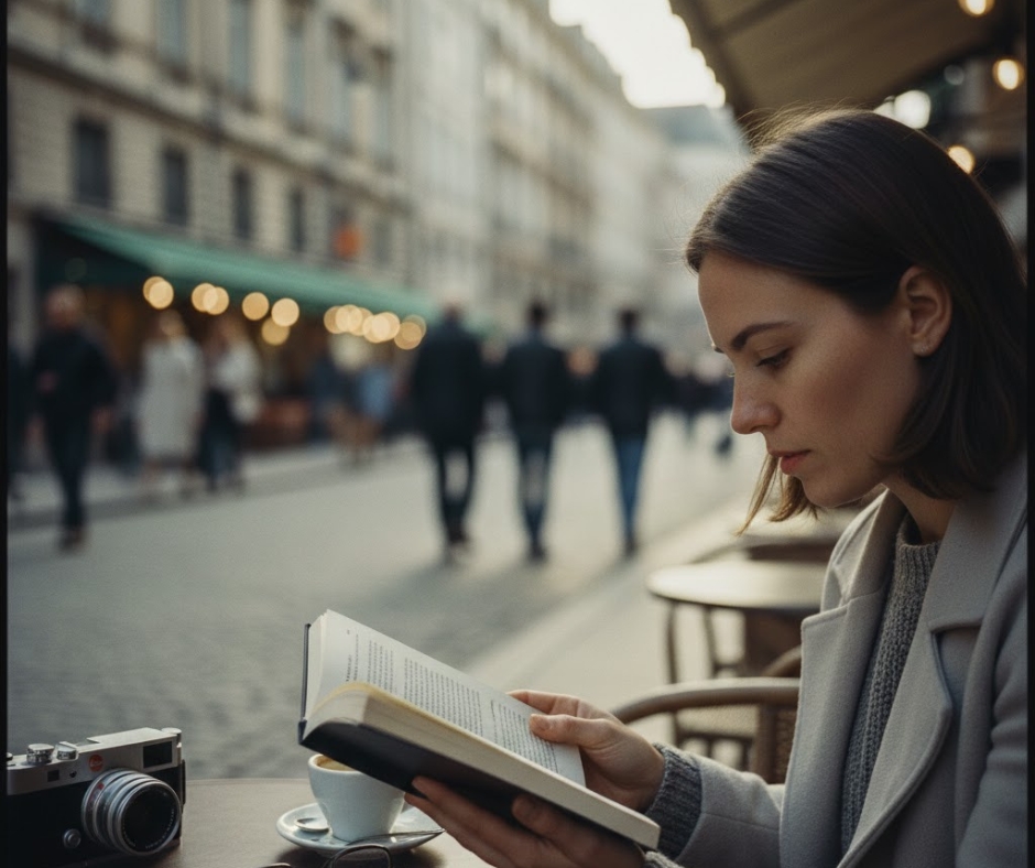 "Candid street portrait of person reading book at outdoor cafe, natural expression, European city background slightly blurred, afternoon natural light, documentary photography style, Leica camera aesthetic"