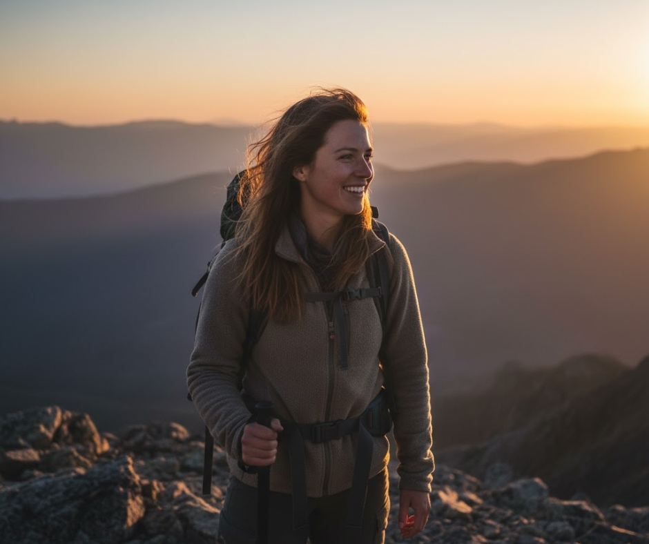 "Natural portrait of hiker at mountain summit, windblown hair, genuine smile, mountain landscape background out of focus, golden sunset light, authentic outdoor photography, shot with professional wildlife camera"